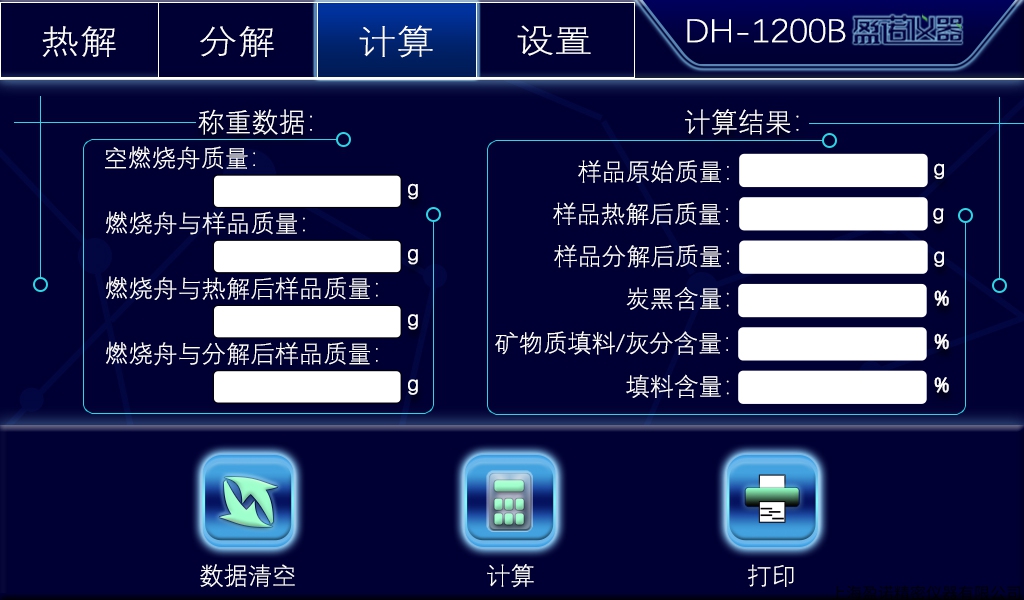 10. 计算方式:输入称重数值后,自动计算炭黑含量、灰分含量以及填料含量