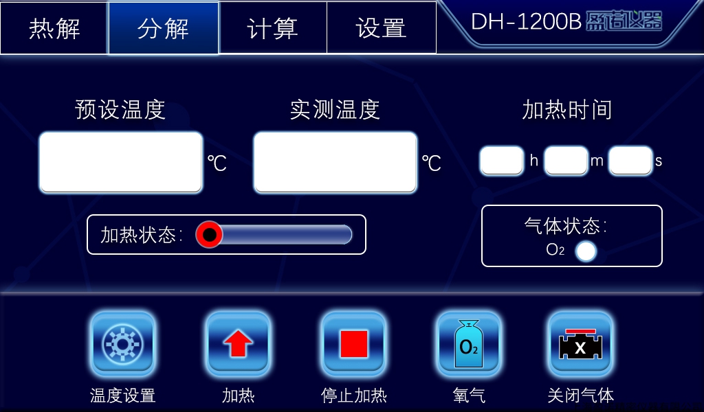 1. 10寸宽大触摸屏操控,当前温度,设定温度,分解状态,热解状态,加热状态,操作时间,充氧状态,充氮状态等信息一体化显示,操作非常简便。